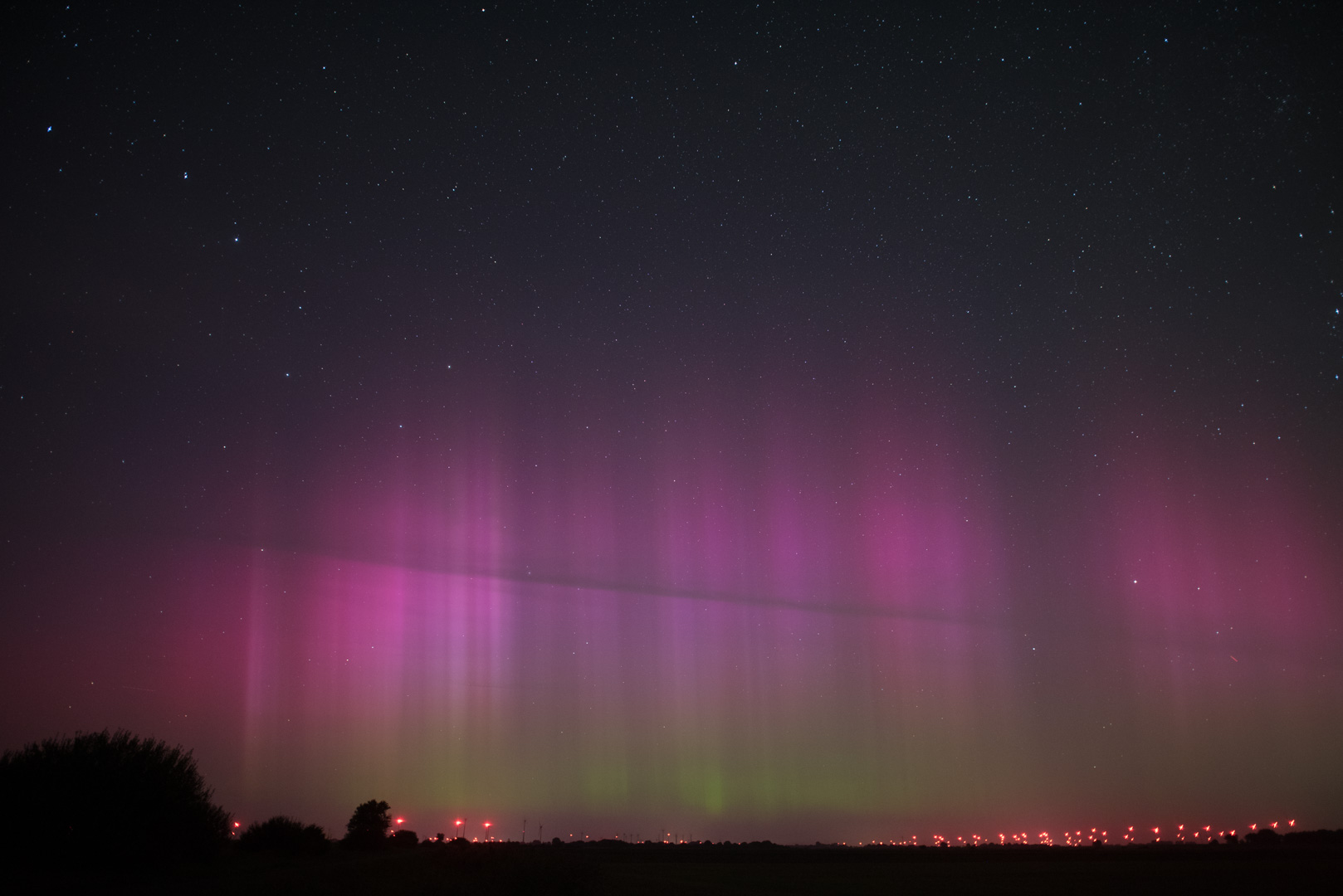 Danach wechselte ich den Standort, um wenigstens die Lichtstreuung etwas zu reduzieren. Ich dachte als erstes, dass ich den Substurm kurz nach 0 Uhr MESZ erwischt hatte, es stellte sich aber heraus, dass es nur Reflexionen von WKAs an aufziehenden tiefen Stratus handelte. Von daher nur der Nachweis vom Abend.