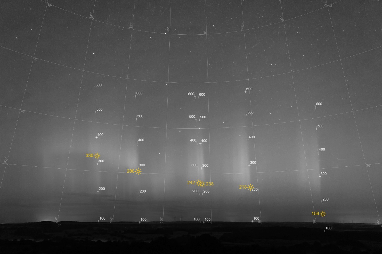 Mit Hilfe des Fotos von Jörg Kaufmann von 03:14 MESZ habe ich ermittelt (Triangulation), wo die Polarlichtstrahlen über Skandinavien gestanden haben und in welche Höhe sie reichten. Das Ergebnis ist das eines typischen Polarlichts (keine Giant Blue Rays), dessen Strahlen bis 500-600 km Höhe reichten, und bei dem der Übergang von grün zu rot in einer Höhe von 200 km stattfindet (wegen der abnehmenden Luftdichte).