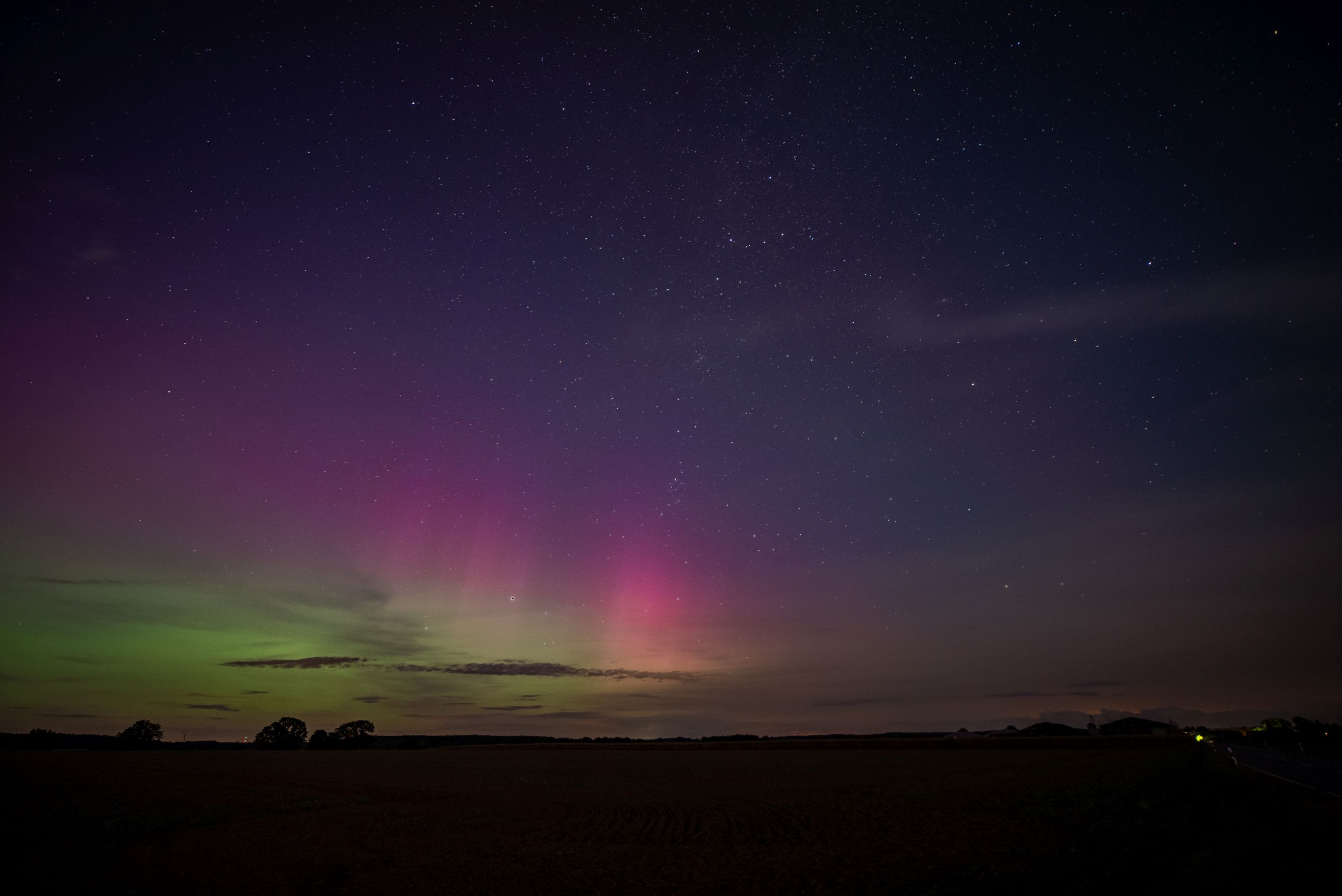 Bei Gallin in MV vorhin deutlich visuelles Polarlicht. Aktuell immer noch schwach visuell. Grüner Bogen vorhin 10° über Horizont. Strahlen bis fast zum Polarstern. Dazu noch ein SAR-Bogen, der durch den Zenit geht.