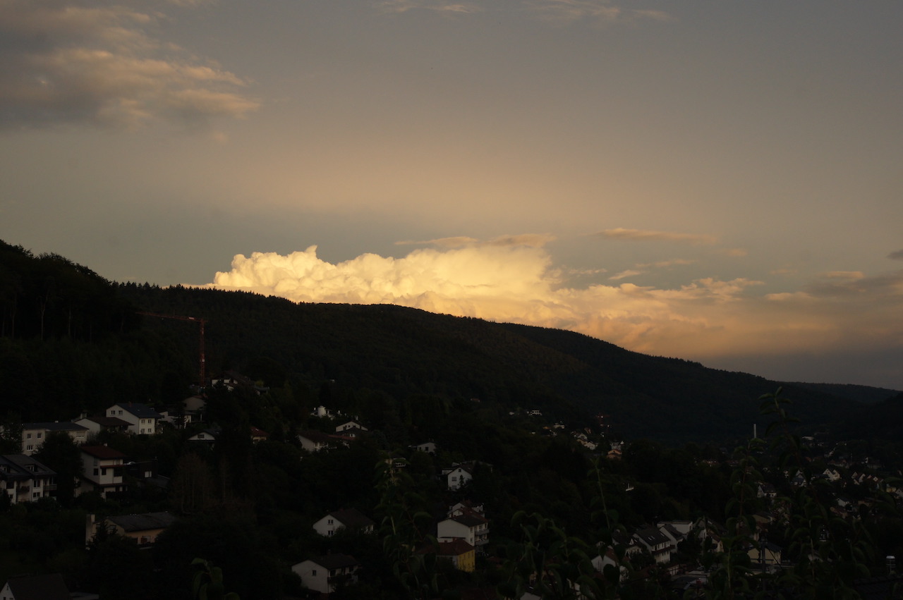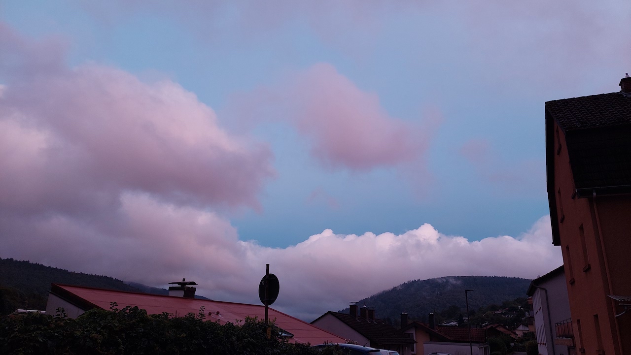 Am 11.9. um 19:53 MESZ (Sonnenuntergang um 19:46) war in der (beginnenden) Dämmerung ein äußerst intensives Blau über den tiefen Wolken zu sehen. Und zwar war es nicht der Himmelshintergrund, sondern im Wolkenbereich selbst. Es war wesentlich dunkler als ein "tiefblauer" Himmel. Eine Minute später (19:54) war die Intensität schon stark zurückgegangen und zwei weitere Minuten später (19:56) zeigte sich der bewölkte Himmel in seinen eher „natürlichen“ Farben.