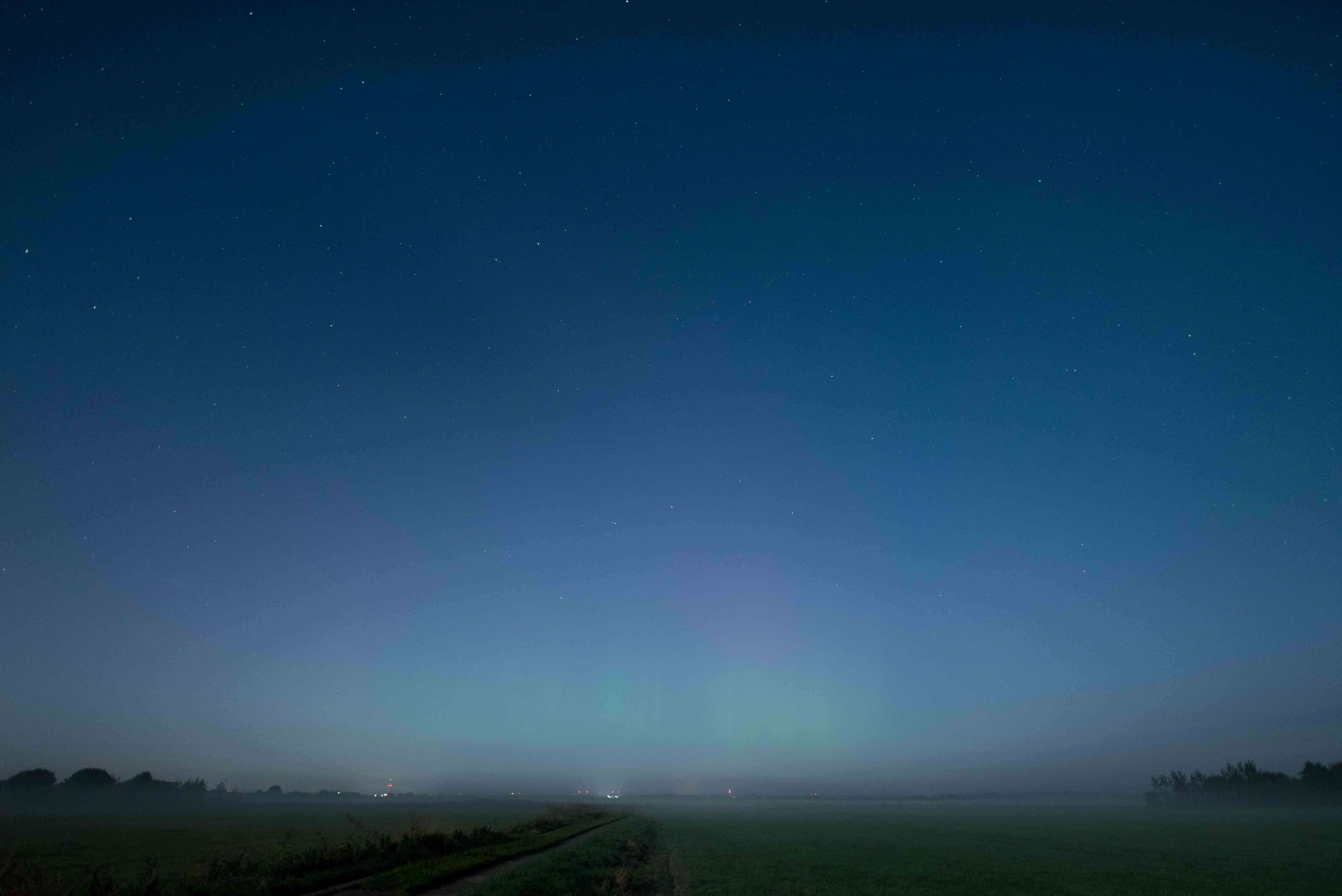 Kommentar: rotviolette diffuse Flächen (DS) und der grüner gleichmäßige Bogen (HA) nur fotografisch; strahlenförmige Bänder (RB) schwach visuell; erschwerte Sicht durch sich auflösenden Bodennebel und Vollmond