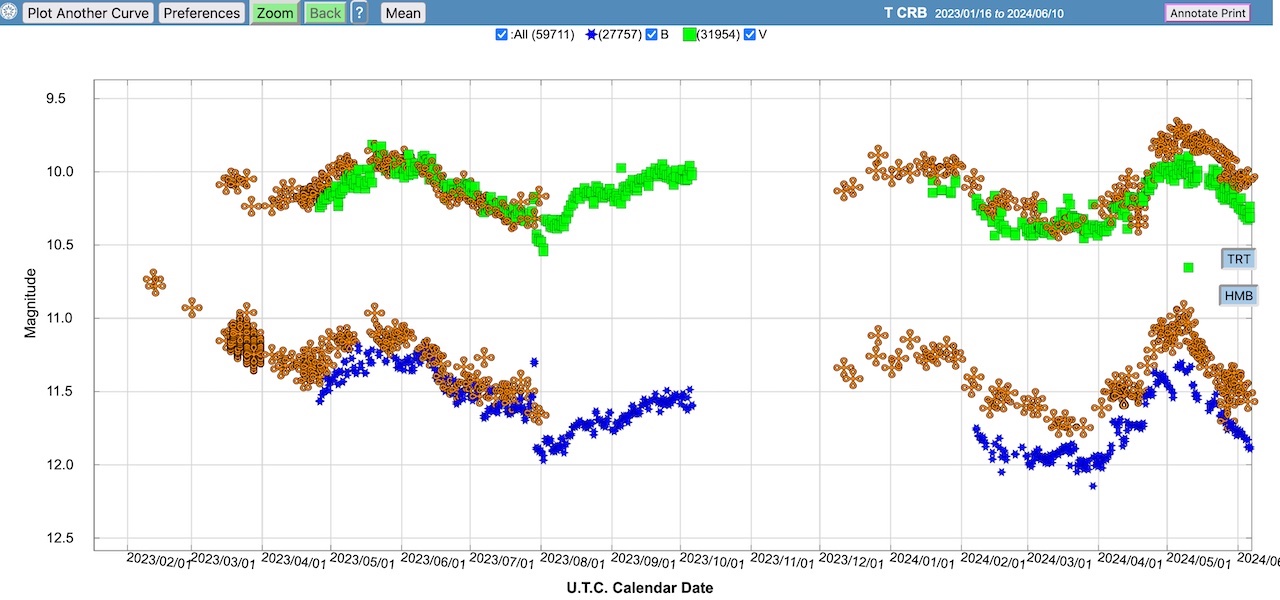 Noch ist der Stern ruhig; und mann kann die Entwicklung hier verfolgen: https://www.aavso.org/LCGv2/. In "Star Name" schlicht "T CrB" eingeben (die grünen Rechtecke zeigen die V mag = visuelle Helligkeit an). Da habe ich gerade gesehen, dass sich der Trend nicht fortgesetzt hat, sondern der Stern vielmehr wieder in seiner normalen Helligkeit in etwa 110 Tagen sehr schön pulsiert. Dennoch lohnt es sich, in jeder klaren Nacht mal in den Sternenhimmel zu gucken...