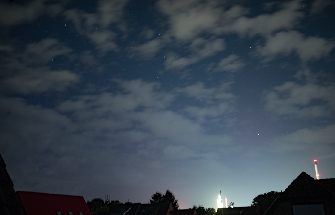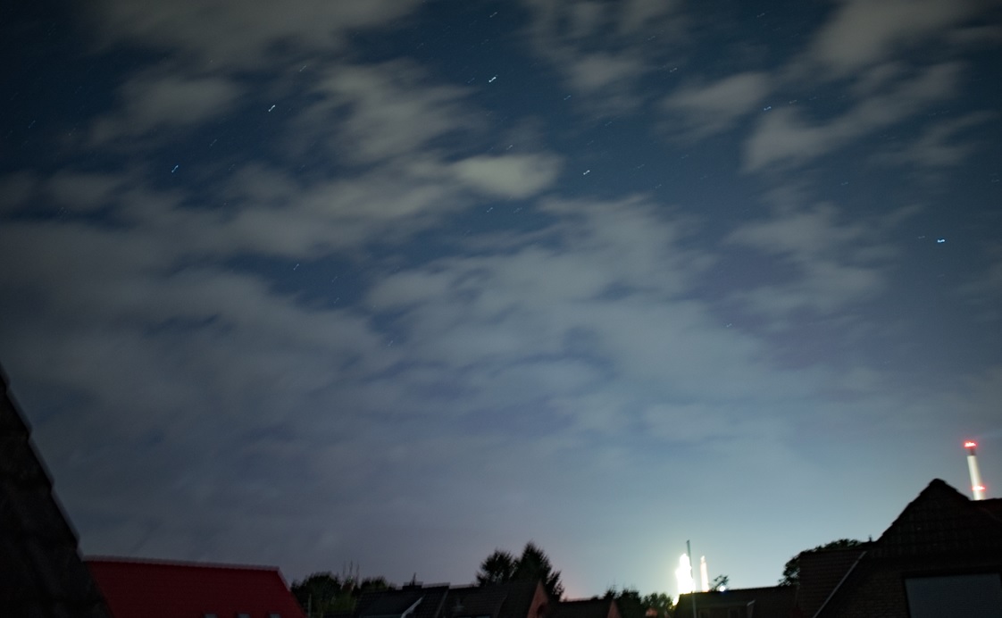 Ich habe gestern auch die Webcams auf Amrum verfolgt. Als dann dort der Himmel rötlich wurde habe ich schnell ein paar Bilder freihändig aus dem ersten Stock geschossen. Nicht einfach mit der hellsten Industrieanlage in Landkreis. Zuerst gab es zu viele Wolken und mit PL war nichts, aber um 00:00 UTC öffnete sich die Wolkendecke für wenige Minuten.
