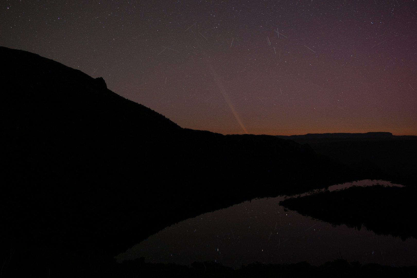 Ich bin gerade im Urlaub in Tasmanien und konnte den Kometen gestern Morgen endlich beobachten. Als es noch komplett dunkel war, ragte zunächst nur der Schweif über den Horizont und war visuell schwach erkennbar. Später auch der Kopf problemlos. Die Bilder sind direkt von der Kamera und völlig unbearbeitet. Standort war ein Grat oberhalb des Lake Hanson auf knapp 1100 m in der Cradle Mountain Region.