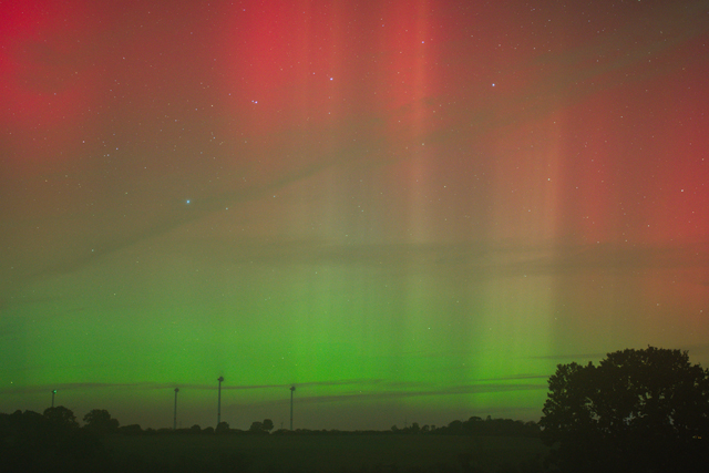 Kommentar: 1. Sichtung in Volkerswurth 21:44 – 23:00 UTC fotografisch rotviolette diffuse Flächen (DS) und grüner gleichmäßige Bogen (HA); 2. Sichtung in Hemmingstedt 23:54 – 00:11 UTC schwach visuelle rosarote diffuse Flächen (DS) und fotografische rote Strahlen; Sichtung durch Lichtsmog eingeschränkt