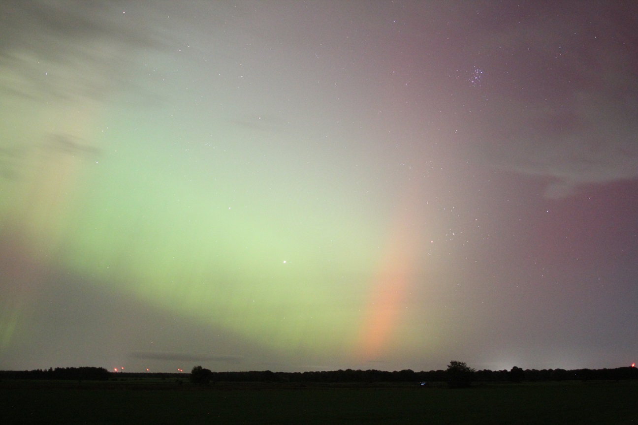Beobachtungsbericht: Ich habe mir diesmal einen etwas dunkleren Standort gesucht, der auch mehr freien Blick Richtung Osten hat. Das war im Nachhinein die beste Entscheidung. In der Dämmerung war erstmal noch nichts zu sehen, es zogen einzelne Wolken durch. Ab etwa 19:40 MESZ schaute der grüne Bogen über einer Wolkenbank im Norden heraus. Langsam gesellten sich violette Schimmer dazu. Alles nur fotografisch sichtbar. Gegen 20:00 MESZ gab ein kurze Aktivitätsphase mit einigen Beamern, diese kündigten einen ersten Substurm ab. Pünktlich dazu zog es fast komplett zu. In den Wolkenlücken war aber rot und Violett auf den Fotos zu erkennen. Ab 20:40 MESZ klarte es dann wieder auf. Der grüne Wahnsinn beginnt, ab jetzt war es auch schwach visuell zu erkennen. Begleitet wurde der grüne Wahnsinn durch einige rote Beamer. Um 21:00 MESZ wurde es dann erstmal wieder ruhig für etwa 30 Minuten. Dann gewann der grüne Bogen deutlich an Helligkeit und stieg in die Höhe. Großes Feuerwerk mit visuell deutlich sichtbaren Beamern ab 22:20 MESZ. Bis 23: 00 MESZ erfasste das Polarlicht den gesamten nördlichen Himmel von Ost über Nord bis West. War im Osten aber viel heller. Rote Beamer hell bis sehr hell visuell zu erkennen, auch die Bewegung war erkennbar. Das grüne Polarlicht war ebenfalls visuell hell erkennbar, blieb aber eher gräulich. Um die Zeitherum war auch der SAR-Bogen fotografisch nachzuweisen. Danach flaute die Aktivität wieder ab, fotografisch tanzten im Osten rote und grüne Polarlichter aber lange Zeit umher. Die Helligkeitswechsel des grünen Polarlichts waren schnell. Um 23:45 zog der Himmel dann leider sehr zügig zu, so dass ich den nächsten Substurm um 1:00 MESZ nicht beobachten konnte.