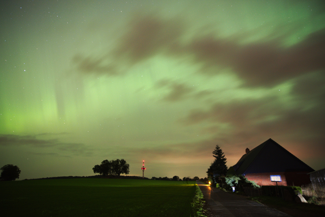 Gegen 20:00 war ich mit meiner Frau noch bei einem Freund, wo wir jedoch auch bereits rote Verfärbungen am Nordhimmel feststellen konnten. Wir sind dann gegen 22:15 Uhr nachhause, in der Hoffnung, mit der Kamera noch etwas reißen zu können. Gegen 22:30 eskalierte es dann völlig und man konnte mitten im Gewerbegebiet auf der Geniner Straße in Lübeck, trotz Lichtverschmutzung, ohne Probleme rote Strahlen sehen.