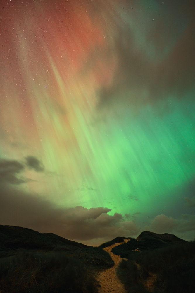 Anfangs nicht viele Strukturen. Alles eher flächig Grün und Rot. Gegen 22.30 Uhr deutlich visuelle helle Beamer. Fotografisch selbst im Zenit der Himmel in rot getaucht. Ab 24 Uhr begann die Wolkendecke zuzuziehen.