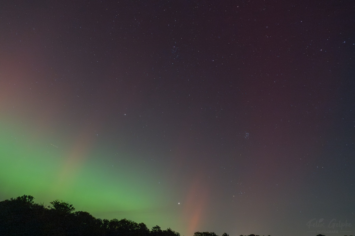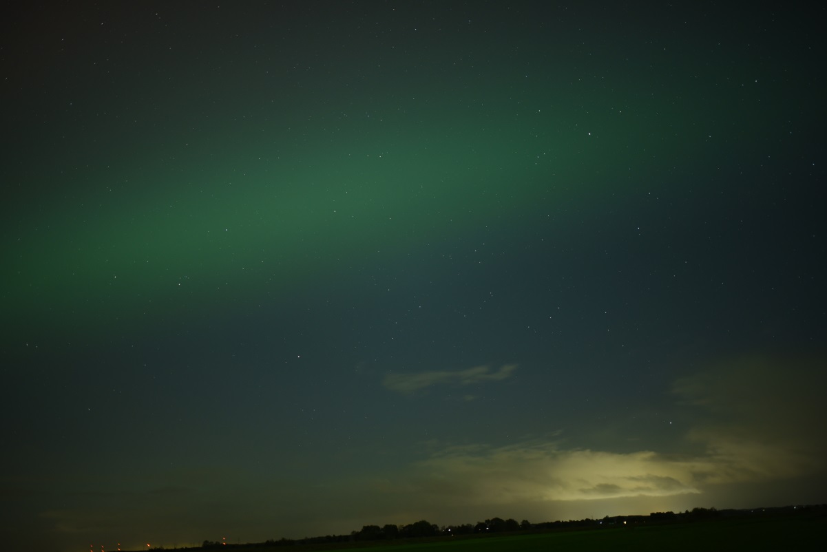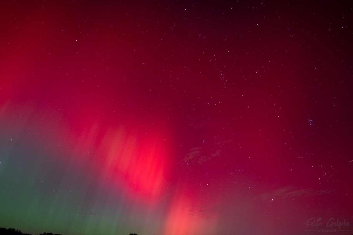 Beobachtungsbericht: Ich habe mir diesmal einen etwas dunkleren Standort gesucht, der auch mehr freien Blick Richtung Osten hat. Das war im Nachhinein die beste Entscheidung. In der Dämmerung war erstmal noch nichts zu sehen, es zogen einzelne Wolken durch. Ab etwa 19:40 MESZ schaute der grüne Bogen über einer Wolkenbank im Norden heraus. Langsam gesellten sich violette Schimmer dazu. Alles nur fotografisch sichtbar. Gegen 20:00 MESZ gab ein kurze Aktivitätsphase mit einigen Beamern, diese kündigten einen ersten Substurm ab. Pünktlich dazu zog es fast komplett zu. In den Wolkenlücken war aber rot und Violett auf den Fotos zu erkennen. Ab 20:40 MESZ klarte es dann wieder auf. Der grüne Wahnsinn beginnt, ab jetzt war es auch schwach visuell zu erkennen. Begleitet wurde der grüne Wahnsinn durch einige rote Beamer. Um 21:00 MESZ wurde es dann erstmal wieder ruhig für etwa 30 Minuten. Dann gewann der grüne Bogen deutlich an Helligkeit und stieg in die Höhe. Großes Feuerwerk mit visuell deutlich sichtbaren Beamern ab 22:20 MESZ. Bis 23: 00 MESZ erfasste das Polarlicht den gesamten nördlichen Himmel von Ost über Nord bis West. War im Osten aber viel heller. Rote Beamer hell bis sehr hell visuell zu erkennen, auch die Bewegung war erkennbar. Das grüne Polarlicht war ebenfalls visuell hell erkennbar, blieb aber eher gräulich. Um die Zeitherum war auch der SAR-Bogen fotografisch nachzuweisen. Danach flaute die Aktivität wieder ab, fotografisch tanzten im Osten rote und grüne Polarlichter aber lange Zeit umher. Die Helligkeitswechsel des grünen Polarlichts waren schnell. Um 23:45 zog der Himmel dann leider sehr zügig zu, so dass ich den nächsten Substurm um 1:00 MESZ nicht beobachten konnte.