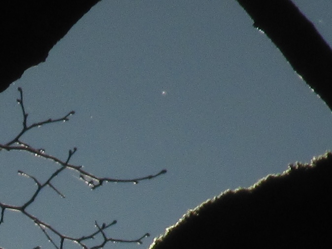 Tagesaufnahme vom 10.10. – sie zeigt, wie außerordentlich schwierig die Tagessichtbarkeit des Kometen war. Dies lag auch an der relativ großen Nähe des Kometen (ziemlich genau die halbe Sonnenentfernung) mit der damit verbundenen großen Koma und der entsprechend geringeren Flächenhelligkeit (in markantem Unterschied zu McNaught 2007!). Eine weitere Tages-Aufnahme vom 10.10 (Quelle) und eine vom 9.10.