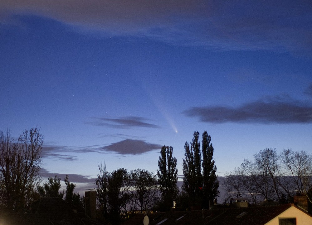 Von einer Freundin ca. 20:15 am Niederrhein zwischen Wolckenlücken aufgenommen. Der Komet war auch mit blossem Auge gut zu sehen, aber richtig schön mit dem Ferngals.