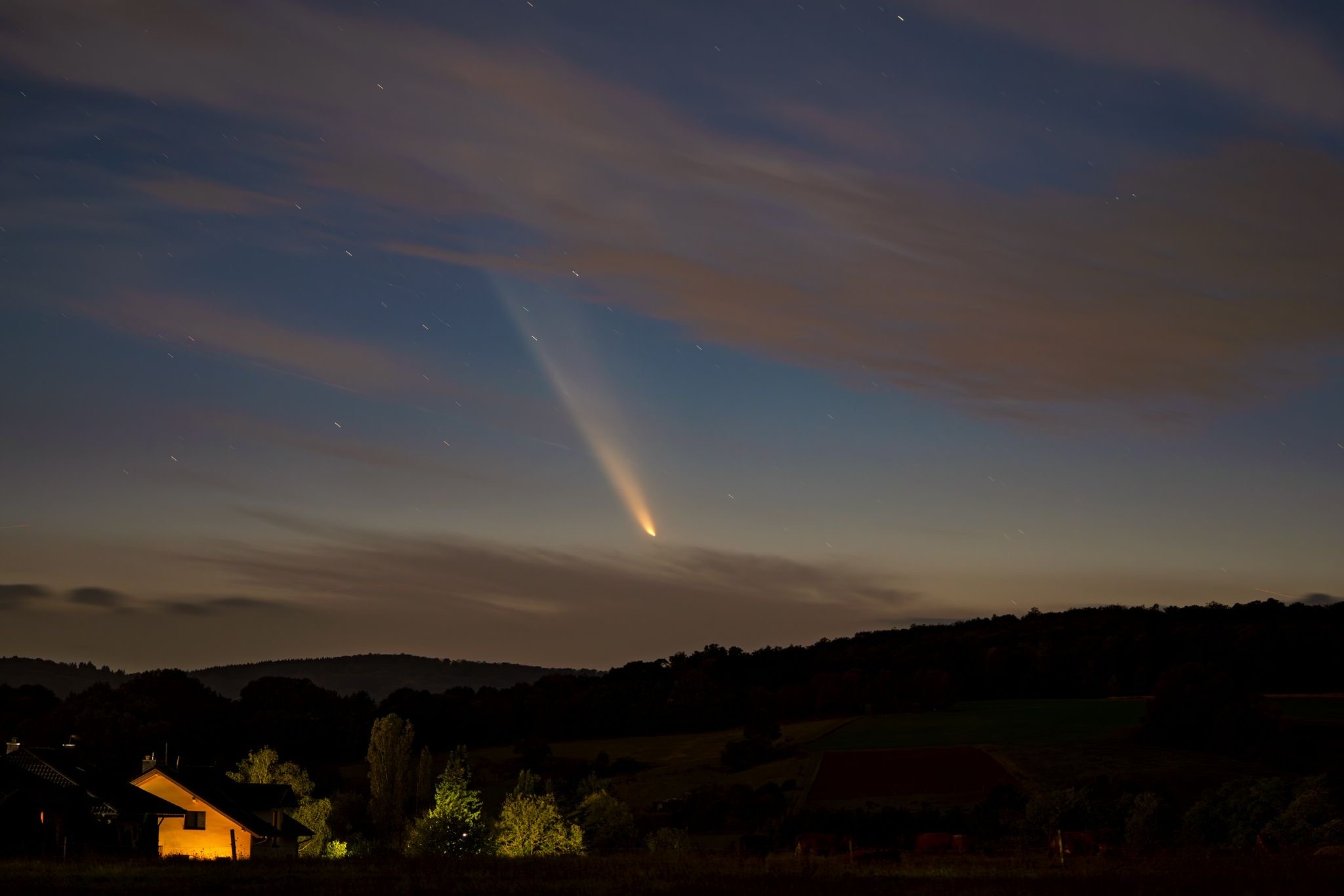 Bei Limburg war er heute gut zu erkennen, aber ohne Dunkeladaption trotzdem schwierig. Man muss sich etwas Zeit lassen, um den Schweif zu erfassen, der schräg nach links oben zeigt. Brauchbare Fotos habe ich nicht, nur einen Verwackler mit deutlichem Schweif.