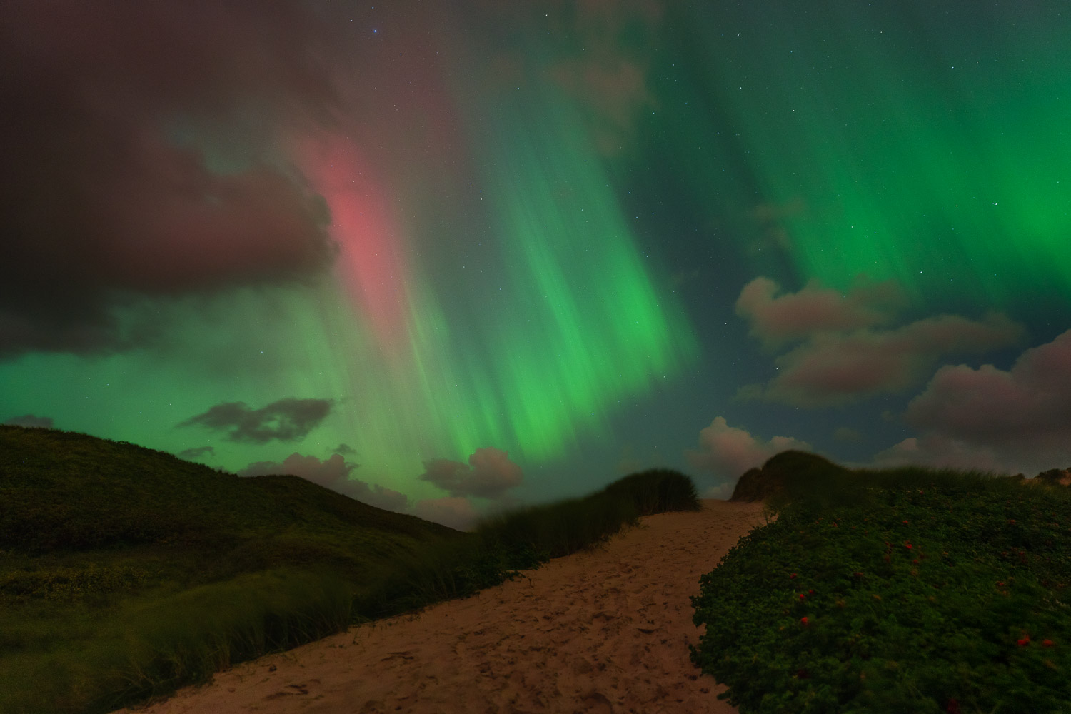 Ab 21:50 wurde auf den Bildern zunehmend grünes Polarlicht erkennbar, welches vom Horizont immer weiter höher stieg. Zu diesem Zeitpunkt war es bereits visuell, aber eher gräulich erkennbar. Nur wenige Minuten später setzte das rote Polarlicht ein, welches sofort deutlich visuell erkennbar war. Ungefähr um 22:20 waren dann auch sämtliche Wolken verschwunden. Wie viel Glück muss man haben?
