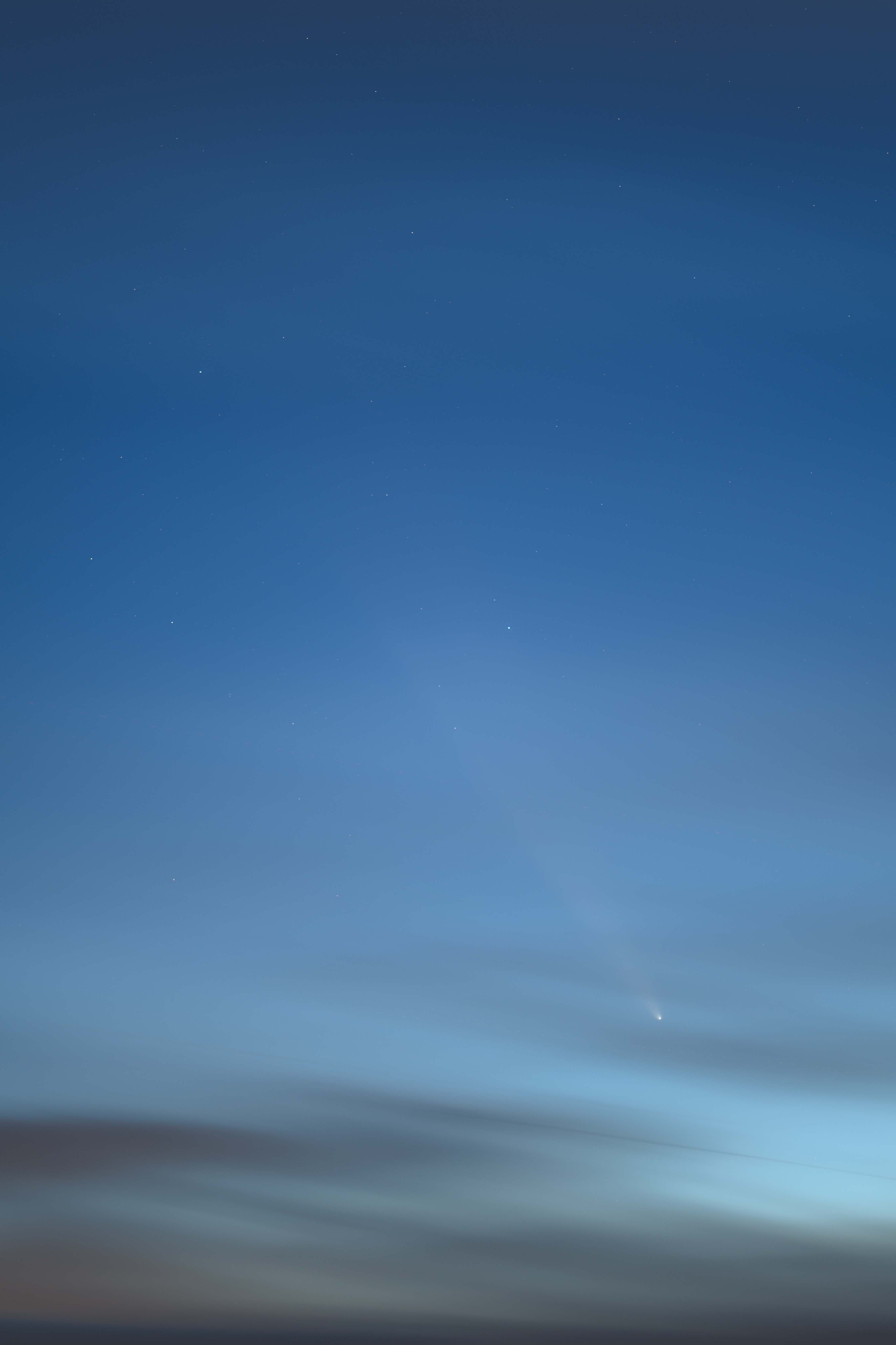 Gestern Abend konnte ich den Kometenkopf bei einer Sonnentiefe von 8° gerade so in einen Feld aus kleinen Wolken erkennen. Später war er auch mit Schweif sichtbar.