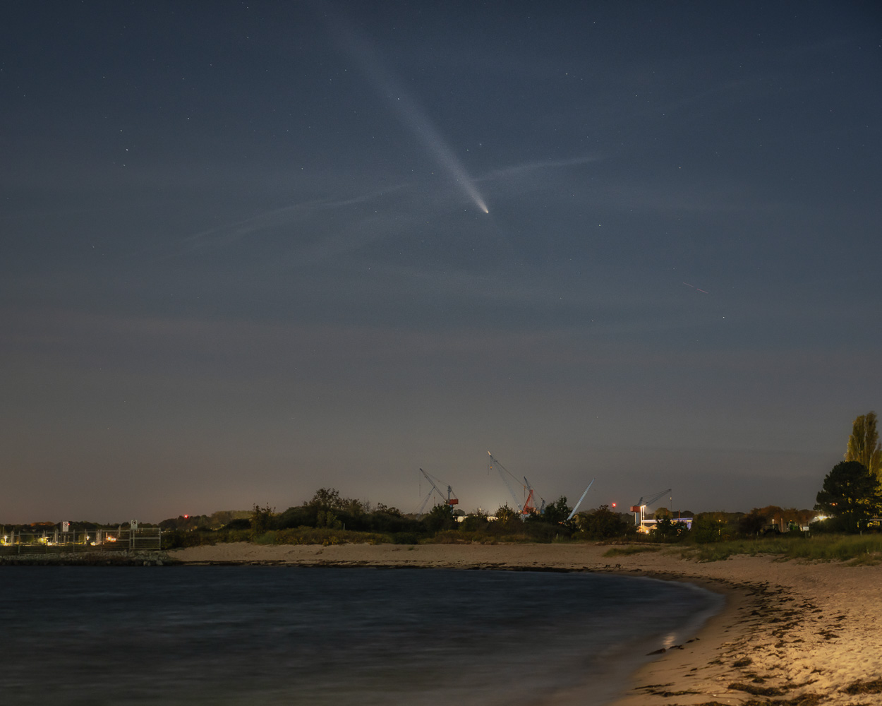 Gestern bei bester Sicht Tsuchinshan-Atlas freisichtig über Kiel auszumachen. Bemerkenswert finde ich die Länge des Schweifes. Bin gespannt, wie sich das Ganze heute präsentiert, wenn der Komet höher am Horizont steht. Sicht soll hier klar bleiben.