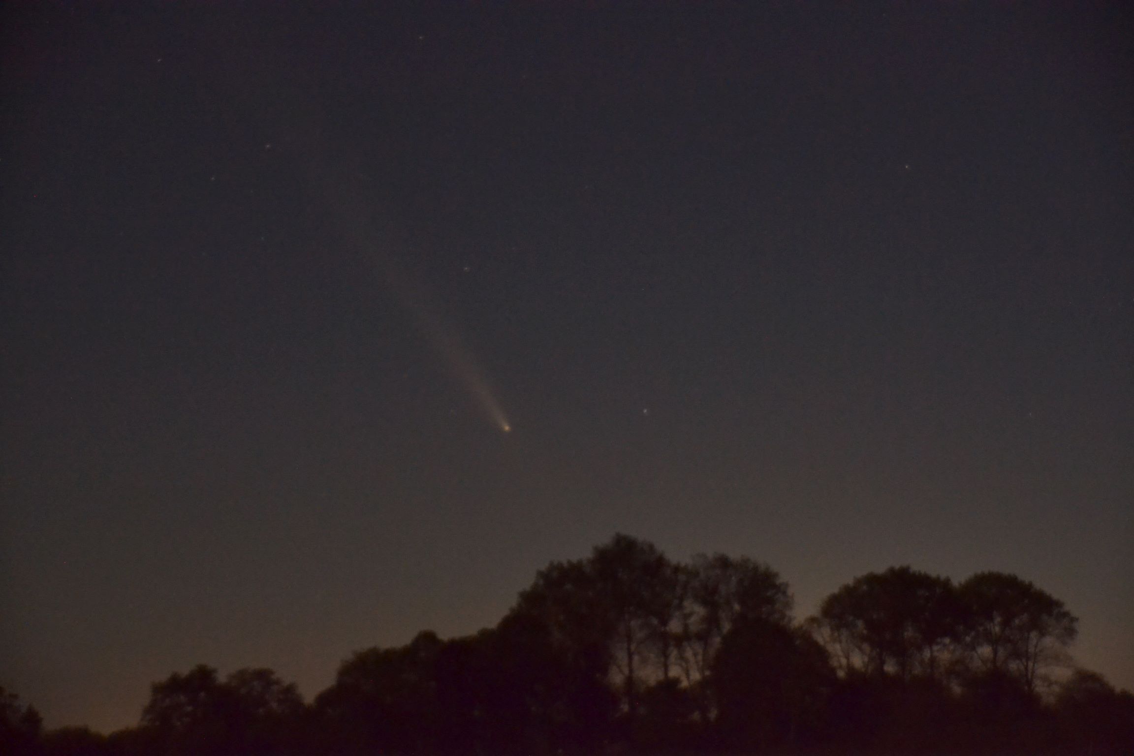 Gestern Abend konnte ich den Kometenkopf bei einer Sonnentiefe von 8° gerade so in einen Feld aus kleinen Wolken erkennen. Später war er auch mit Schweif sichtbar.