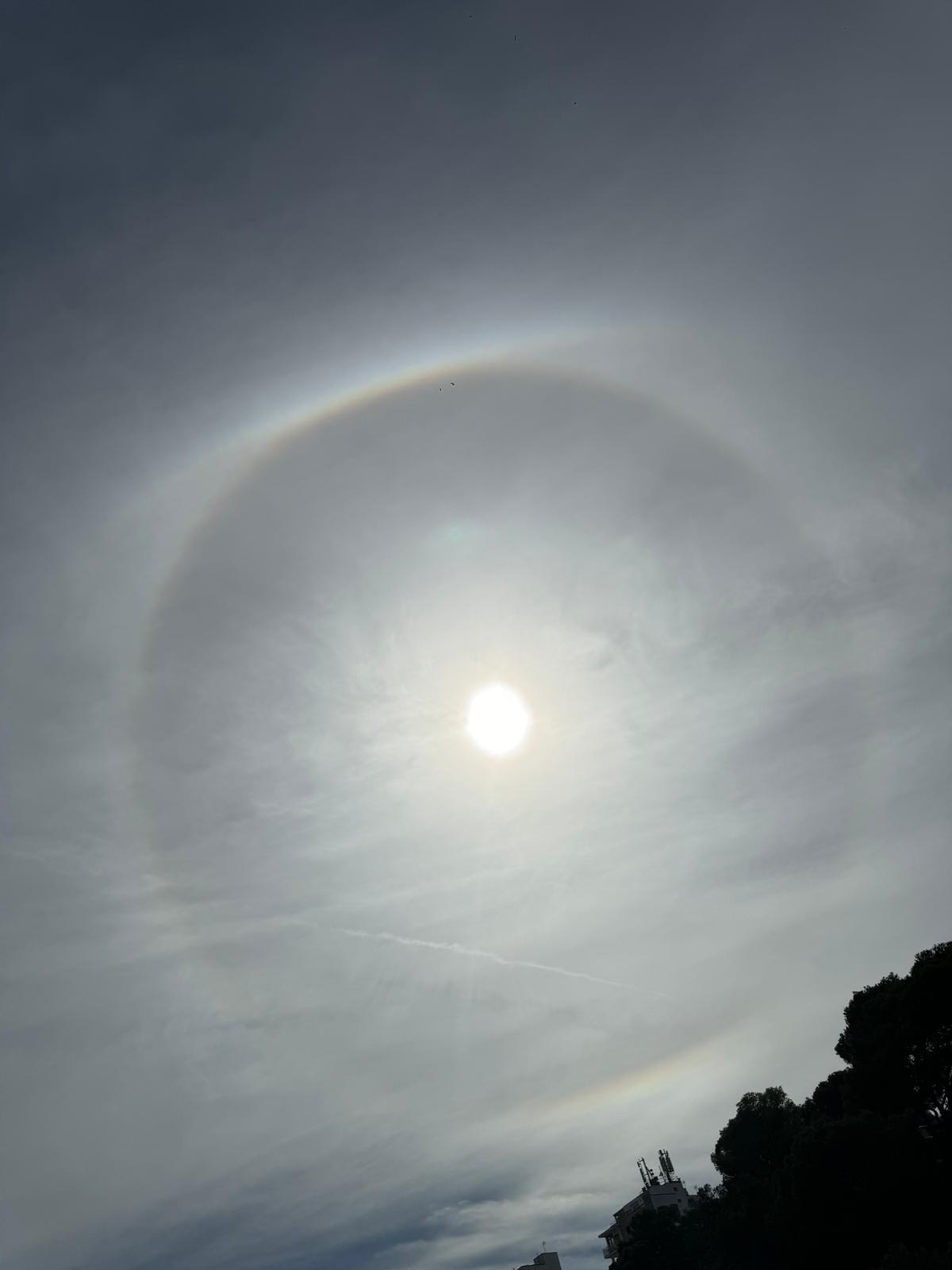 meine Freunde machen gerade Urlaub auf Mallorca und haben mir das angehängte Bild geschickt, als Gegenstück zu meinen PL-Fotos. Mal abgesehen von dem schönen Halo ist mir der grüne Fleck über der Sonne ins Auge gefallen. Ist das ein Lensflare oder C2023 a3, den sie da zufällig mit drauf haben???