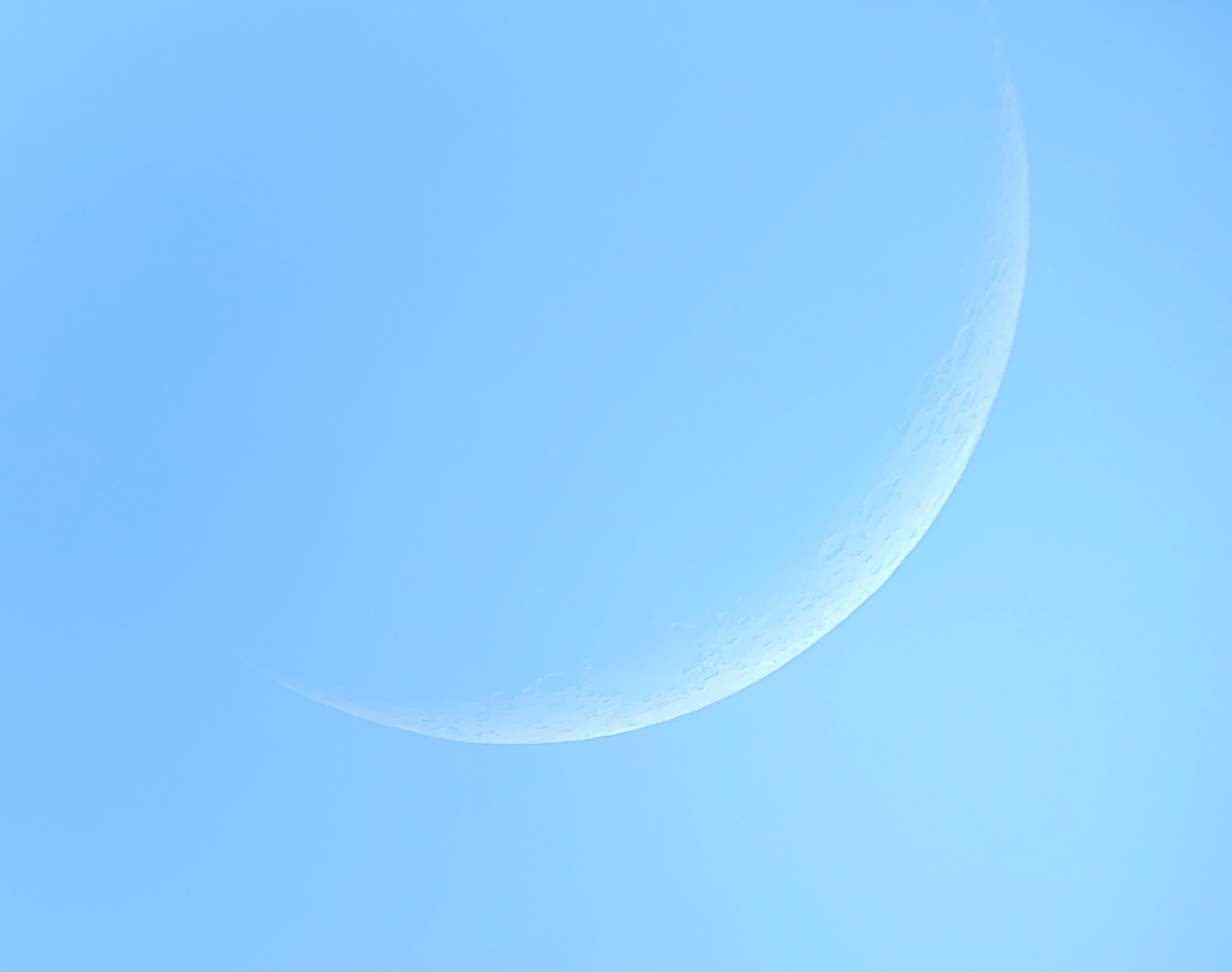 Das heißt aber nicht, daß das bei höherem Mondstand und/oder in trockener Luft nicht möglich gewesen wäre. Am 7.7.24 gelangen Christoph und mir nachmittags Sichtungen in 20 und 22 Grad Elongation, da war aber der Himmel nur ein oder zwei Drittel weniger hell als heute früh. Außer an exzeptionell klarem Winterhimmel am 28.12.24 (Kulmination gegen 10:15 in 30 Grad westl. Elongation und nur 14 Grad Höhe) oder 1.1.25 (Kulmination gegen 13:55 in 20 Grad östl. Elongation und 16 Grad Höhe) werden wir nun auf die steiler über der Sonne stehenden Monde ab Februar warten müssen.