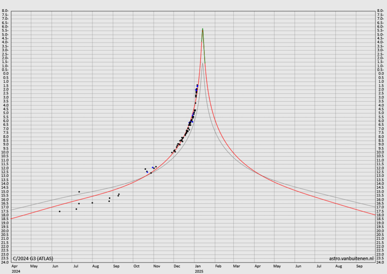 Wenn sich der Helligkeitstrend fortsetzt und die Lichtkurve tatsächlich auf die Juni–Sept-Werte fallen sollte, dann würde die Spitzenhelligkeit noch weiter ansteigen und die Januarwerte wohl wieder auf der (roten) Lichtkurve liegen. Dann wäre eine Maximalhelligkeit von evtl. etwa -8 mag möglich. Das würde wiederum der ursprünglichen Prognose der BAA (British Astronomical Association, stand 2.11.2024) nahekommen, die auf eine Maximalhelligkeit von etwa -12 mag kam. Dieser Wert erschien mir stets viel zu hoch, so dass ich ihn ignoriert habe – gerade auch hinsichtlich der stets aktualisierten Prognose von van Buitenen. Die Prognose der BAA wurde inzwischen (am 4.1.2025) aktualisiert und entspricht nun der von van Buitenen (aktuelle Graphik).