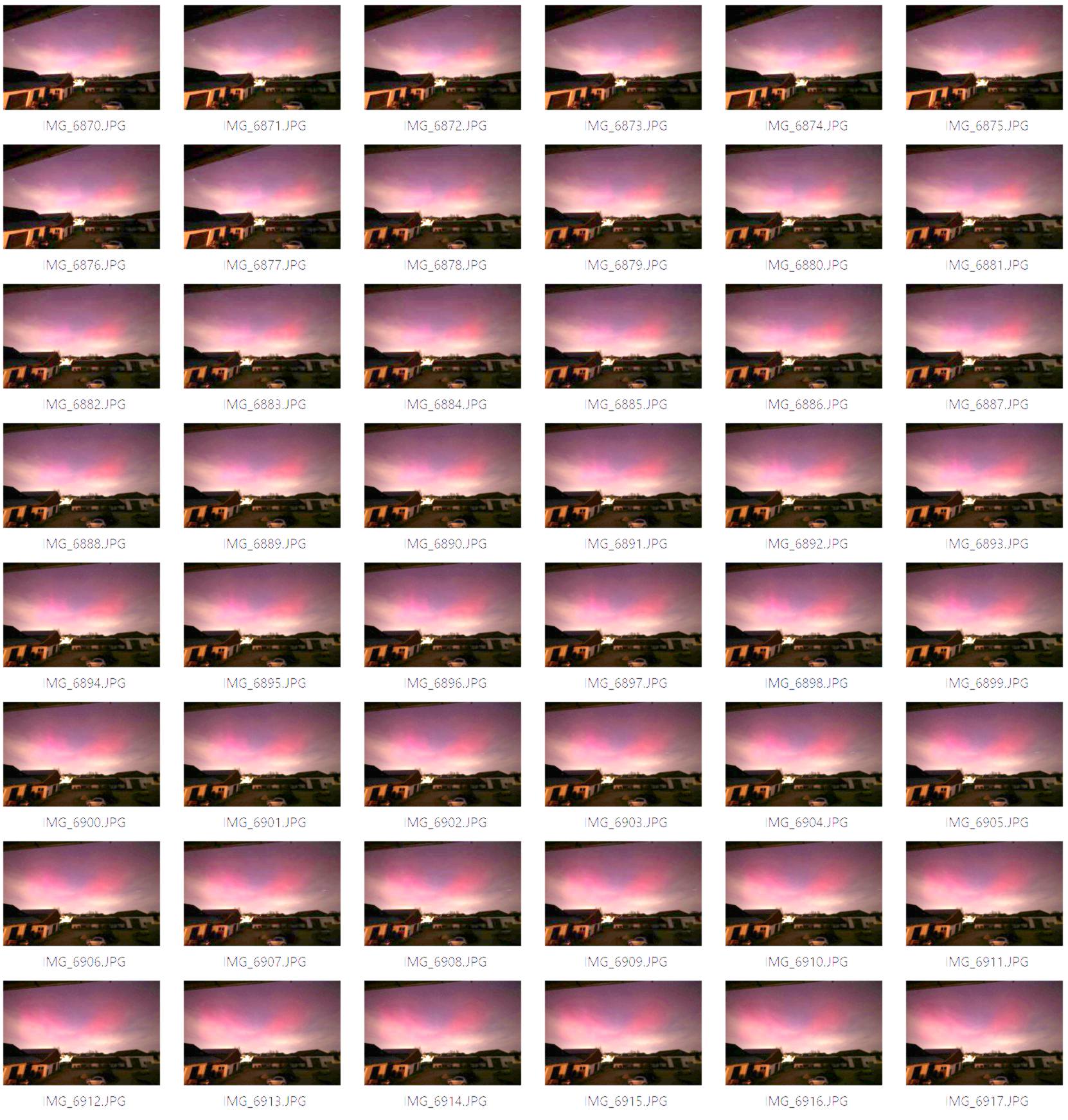 In Lörrach zwischen ca. 18:20 bis 18:50 fotografisch, ab 18:30 für ca. 3 min schwach visuell rotes Glimmen in einem relativ kleinen Bereich, zeitgleich mit den starken Ausschlägen an den norwegischen Magentometern.