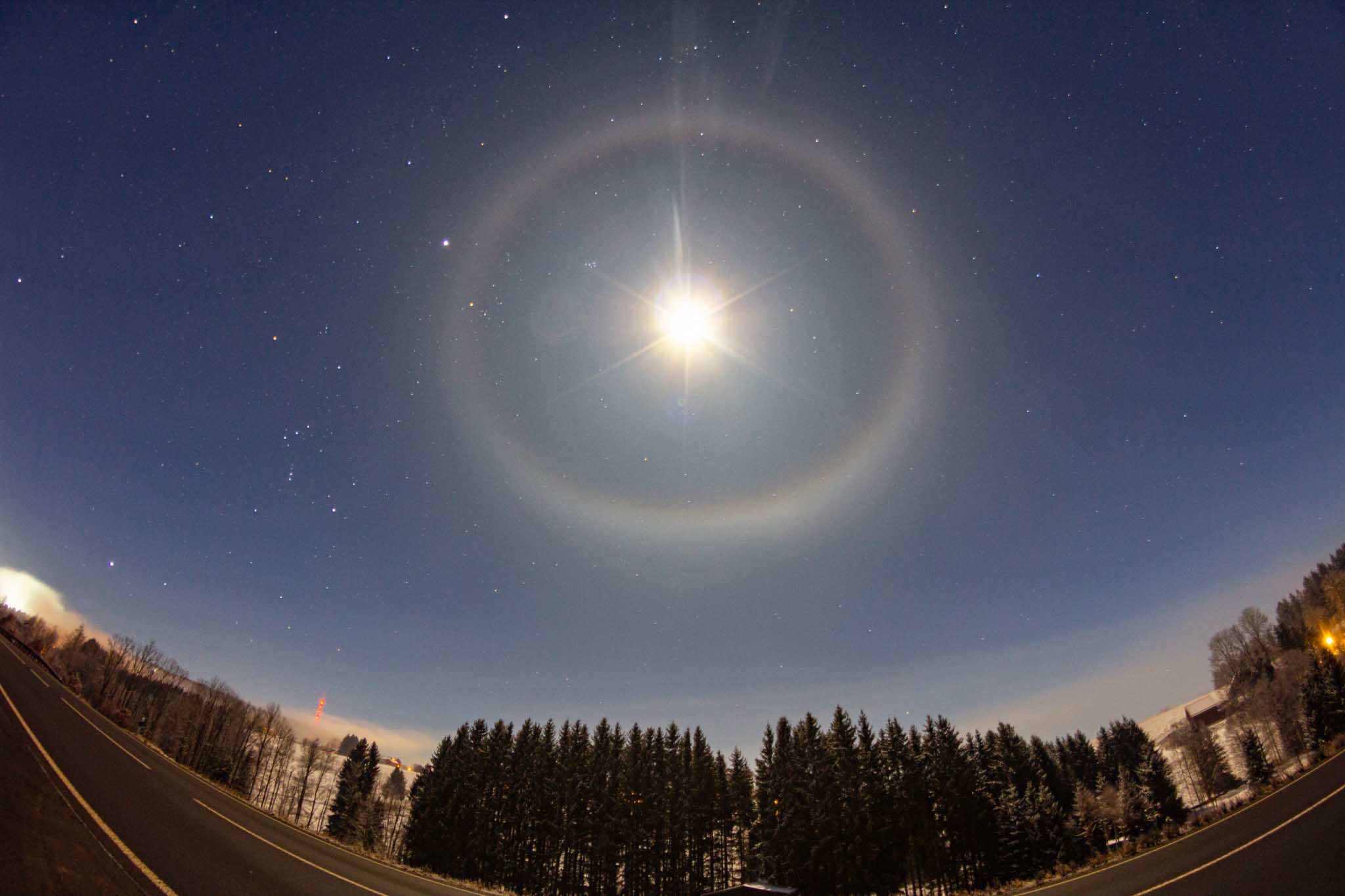 Noch vor Bischofsgrün praktisch die erste Möglichkeit anzuhalten. Ging es direkt los. An entgegenkommden Fahrzeugen traten Lichtsäulen auf. Also direkt stehen geblieben. Am Mond zeigte sich ein schöner umschriebener Halo. Die Temperatur lag laut Autothermometer um -4°C.