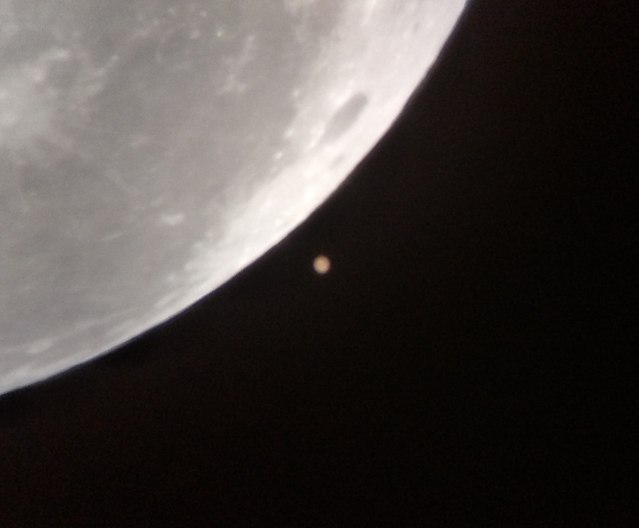 Einigen wird die enge Konjunktion von Mond und Mars heute aufgefallen sein. In Nordamerika und auf den Kanaren gab es sogar eine Bedeckung. Das angehängte Bild stammt von meinem Telefon, gemacht am 250mm-Newton, kurz vor Bedeckungsbeginn.
