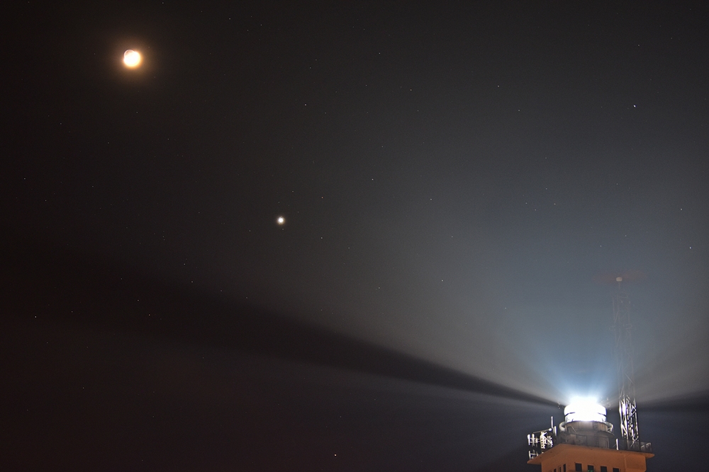 Das erste mit Mond und Venus entstand um 17:55 Uhr Um Mond, Venus und Saturn auf ein Bild zu bannen, störte ein wenig unser Leuchtturm.