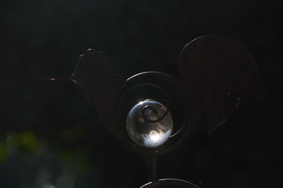 An einem Gartenstecker brach sich das Licht in einer dort hängenden Spinnwebe in orangerot.