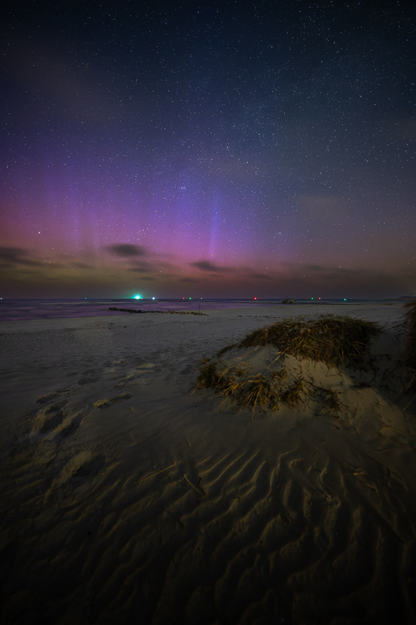 Das erste Polarlicht war für mich um 19:53 Uhr fotografisch nachweisbar. Gegen 00:23 bemerkte ich auf der Kamera einen relativ hohen blauen Strahl der über das normale Polarlicht heraus ragte. Gegen 02:35 Uhr vermute ich eine Phase mit GBR´s. Die stärkste Aktivitätsphase für mich, begann gegen 02:28 Uhr, als sich auch die Farben des Polarlichts in Lila/Blau veränderten. Gegen 04:33 Uhr beendete ich die schöne Nacht am Strand.