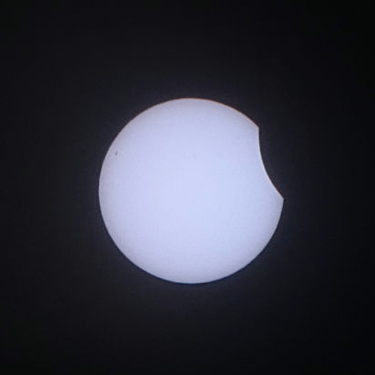 Hier in Heidelberg gab es vormittags Halos – SoFi mit Halo wäre was schönes gewesen. Dann aber zog es sich rechtzeitig völlig zu, so dass ich die SoFi schon abgeschrieben hatte. Dann tat sich aber doch noch ein "Fenster" in den tiefen Cu (Sc?) auf (12:27–12:36). Die As-Schicht darüber war zu dünn, um die Sonne ausreichend abzudämpfen, und die Cu darunter zu dick (sie verursachten eine "totale" SoFi). Aber in den Lücken der Cu (also an deren Rändern und dünneren Partien) konnte ich die angeknabberte Sonne dann entsprechend gut sichten. Auch wenn der scharfe Mondrand erkennbar war, war der Bogen des Mondrandes wohl doch zu kurz, um ihn so auffällig mit dem Sonnenrand zu kontrastieren, wie es bei der SoFi im Oktober 2022 gewesen ist. Dazu sind wohl mehr als die heute hier erreichten 15% Sonnenbedeckung nötig.