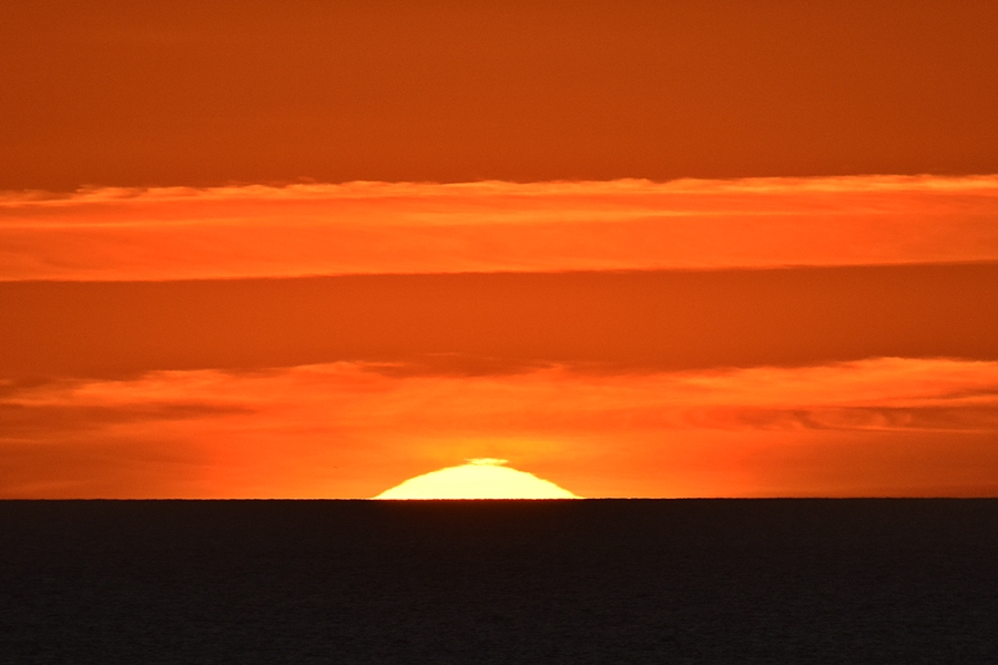 Selbst die untergehende Sonne unmittelbar am Horizont ist noch gleißend.