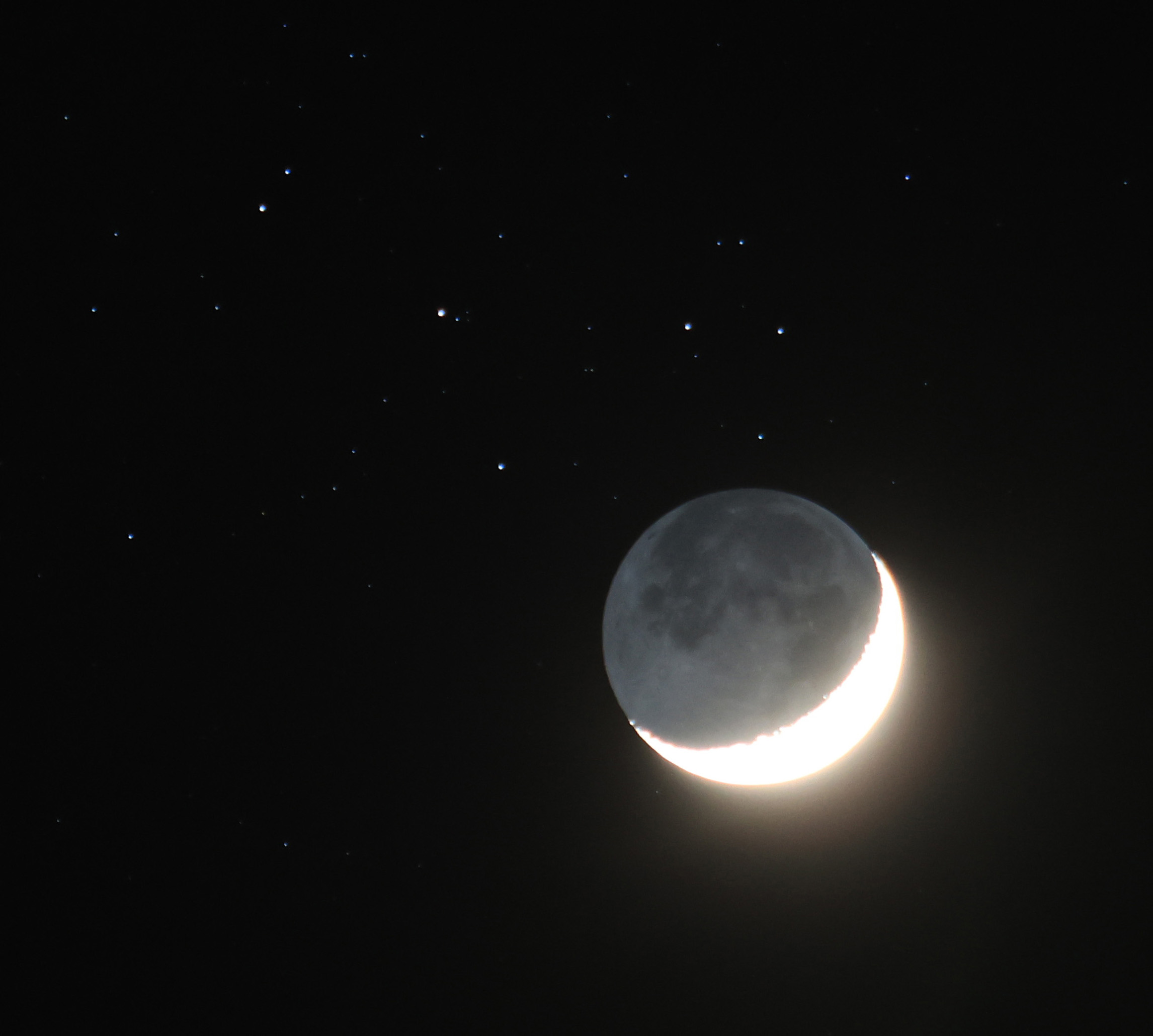 Hier zwei Bilder von dem Abend. Zuerst vom frühen Abend, als noch ordentlich Platz zwischen Mond und Plejaden war: