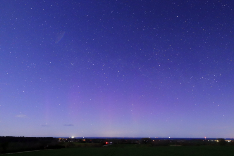 nicht viel, aber immerhin etwas. Überwiegend war es rot-violettes Glimmen. Im Ansatz sind aber auch einzelne Strahlen erkennbar. Auf dem Kameradisplay sah das teilweise etwas anders aus, wo die Strahlen durchaus erkennbar waren. Anbei zwei Fotos: