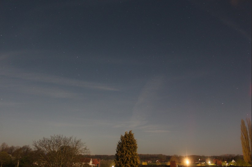 Geht nicht, gibt's nicht. In diesem Sinne entstand diese 6er-Serie eines schwachen fotografischen Polarlichts in Form eines ca. 3 Minuten nachweisbaren, wandernden violetten Beamers während einer Nachtwanderung in der Altmark durch die erste laue Vollmondnacht dieses Jahres, die nicht nur in Hinblick auf den anstehenden Meteorstrom der Lyriden Lust auf mehr machte. Es gab wieder einiges zu sehen und zu hören. In Erinnerung davon dürften neben einer Begegnung mit einem großen Rudel von Hirschen in der Abenddämmerung diverse Halos am Mond in der zweiten Nachthälfte oder die aufgehende Venus in der Morgendämmerung begleitet vom Gesang der nach und nach erwachenden Feldlerchen bleiben.