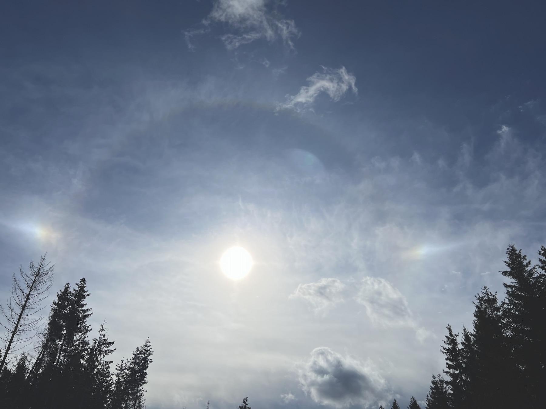 Heute Abend zw. 18:45 Uhr und 19:45 Uhr konnte ich eine linke und rechte Nebensonne beobachten. Anfangs konnte ich nur die rechte Nebensonne erahnen, welche mit der Zeit immer intensiver und farbenreicher wurde. Die linke Nebensonne kam erst etwas später dazu, welche mit der Zeit ebenfalls immer intensiver wurde.