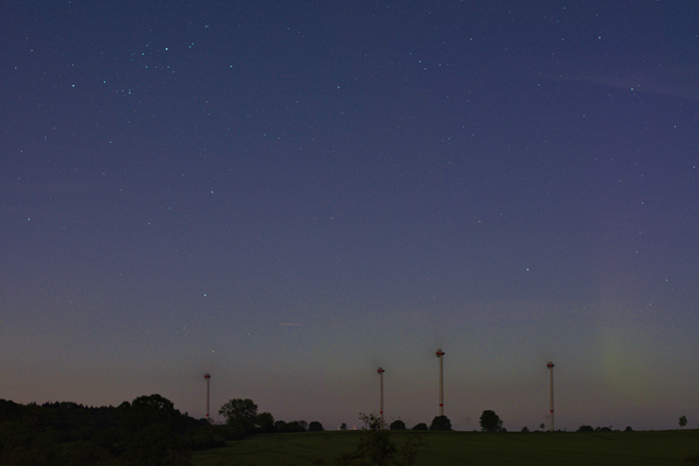 Auch aus Büdelsdorf gegen 01:25 MESZ und zwischen 02:00 und 03:00 MESZ schwaches fotografisches Polarlicht, rote Beamer. Auch am 09.05. war noch schwächeres PL kurzzeitig auszumachen.