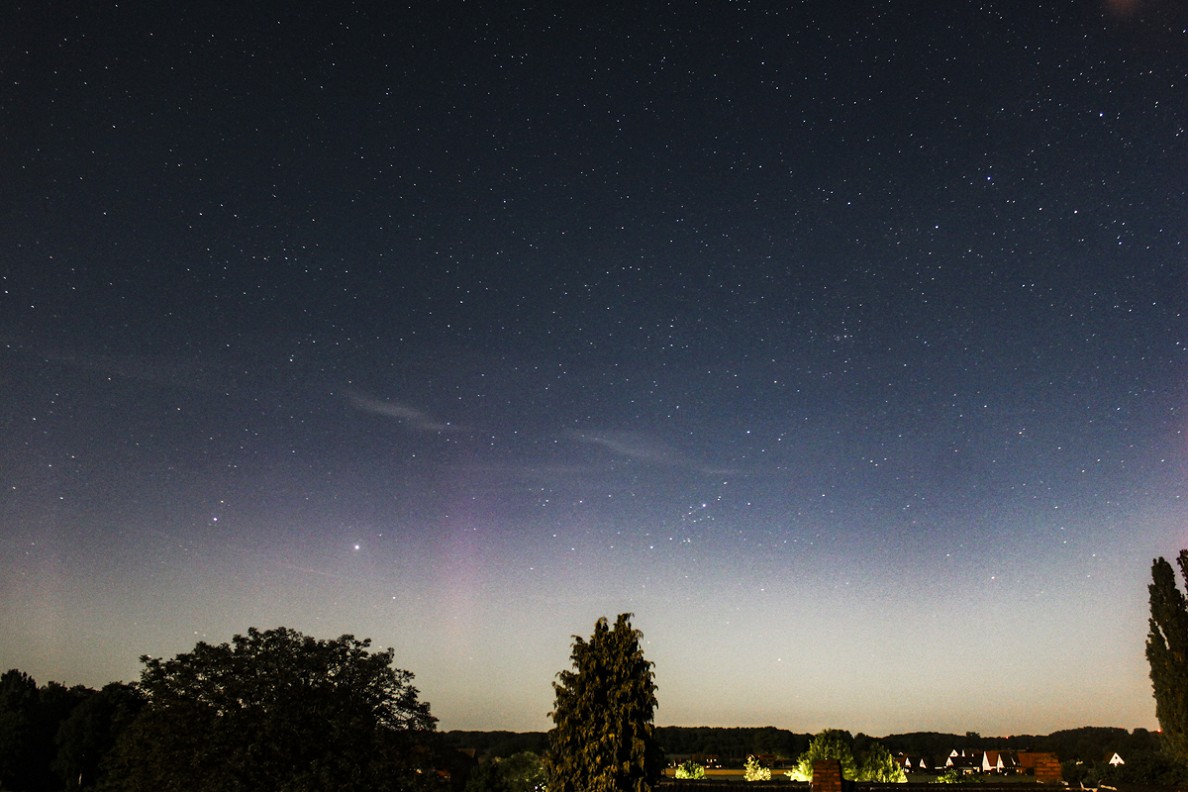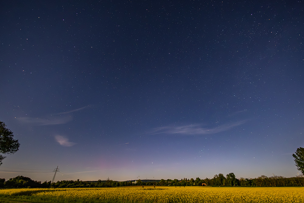 das Polarlicht in dieser Nacht war doch recht kurz nur nachweisbar und kam dann, als man schon dachte, dass jetzt alles vorbei wäre. Das erste Mal etwas nachweisen konnte ich gegen 02:18 MESZ: Kurz danach waren auch einzelne Strahlen erkennbar: Wenig später ließ es dann auch schon wieder nach, einen Strahl gab es dann aber doch noch: