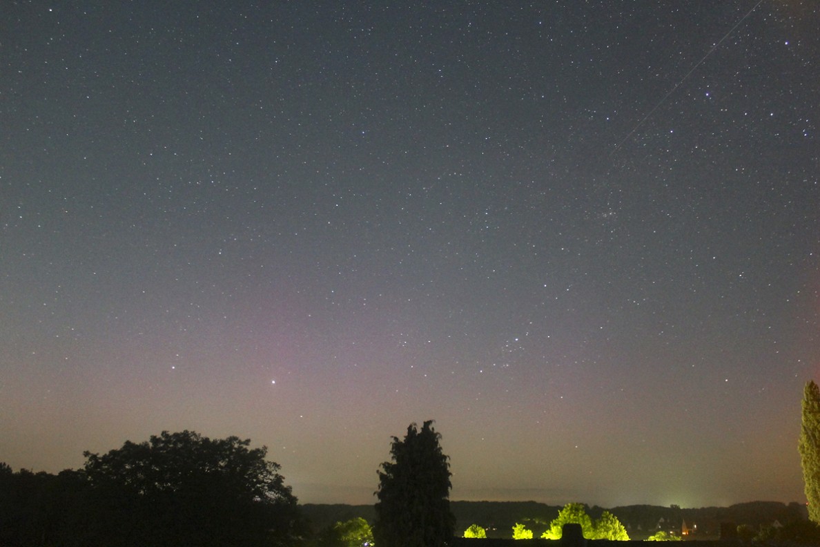 ein Polarlicht am Standort bei Lübbecke (entspr. ca. 52.3°N), gejagt von der einsetzenden Morgendämmerung: Ab ca. 01:57 MESZ hielt an meinem Standort die astronomische Dämmerung Einzug.