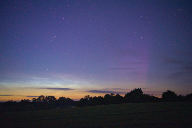 Zu den quasi ganznachts-NLC (min. 20:57 - min. 01:40 UT) gesellte sich Polarlicht in der Dämmerung.
