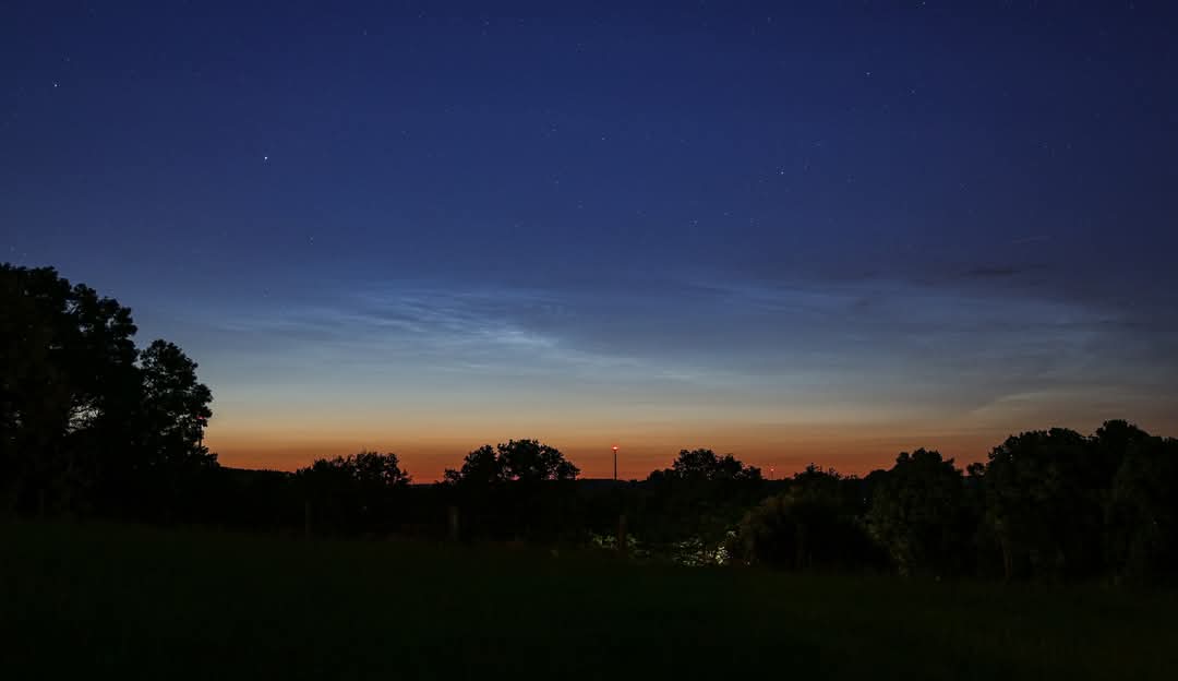 Polarlicht fotografisch, NLCs freisichtig Helligkeit 2, Höhe bis zu 10 Grad, Azimut 320-40 Grad, verwobene Streifen, schwache Rippeln, ein markanter Ast von Nord nach rechts oben steigend...