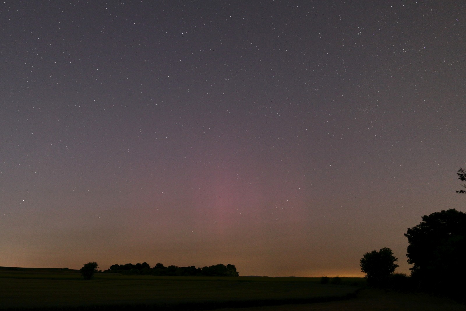 Kommentar: rot-violettes Polarlicht als diffuse Fläche mit einzelnen Beamern. Recht diesige Luft, evtl. u.a. noch durch Rußpartikel der kanadischen Waldbrände?