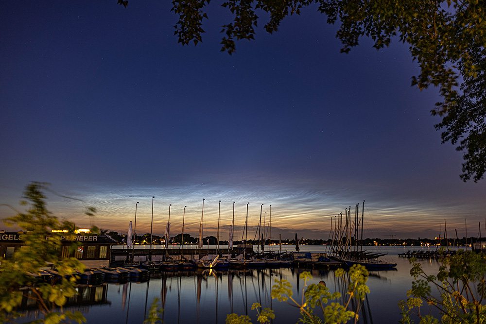 Die NLCs waren bereits kurz nach 22:30 Uhr sichtbar geworden als sehr schwache Streifen. Ich positionierte mich an der Außenalster in Hamburg, was für mich ein schöner Beobachtungsort mit tollen Motiv war (Wasser+Boote). Dort konnte ich dann ein recht ansehnliches Display beobachten, was schnell von Helligkeit 2 auf 3 anstieg. Die meisten NLCs endeten etwas über Capella in etwa 13° Höhe, zu Beginn konnte ich aber auch darüber noch schwache Strukturen ausmachen (zogen in die selbe Richtung wie die NLCs darunter), welche bis 35° gingen. Im Anschluss pendelte es sich bei knapp über Capella ein, sank im Verlauf dann auf etwas mehr als die Hälfte der Höhe von Capella ab. Was mich am meisten erstaunte war die Helligkeit, welche bis H4 anstieg. Selbst in der doch recht hellen Umgebung in Hamburg waren die Leuchtenden Nachtwolken sehr auffällig und die Strukturen klar sichtbar. Erst zum Ende hin nahm die Helligkeit wieder allmählich auf 3 ab. Gegen 1 Uhr beendete ich dann die Beobachtung aufgrund von Wolkenaufzug. Anbei ein paar Bilder: Ein Zeitraffer der NLCs gibt es hier: https://mbwetter.de/wetter/NLC/2025/NLCs_170625.mp4