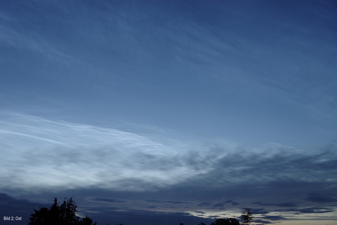 Dass die NLCs zu diesem Zeitpunkt bereits so präsent waren, ließ mich darauf schließen, hier später von noch helleren NLCs berichten zu können. Um etwa 23:25 MESZ war es dann soweit, NLCs der Helligkeit 3 waren sicher: