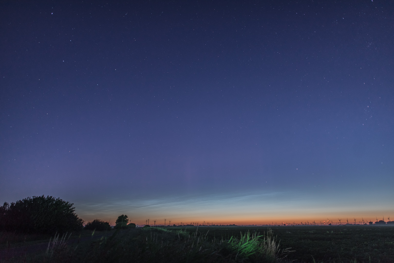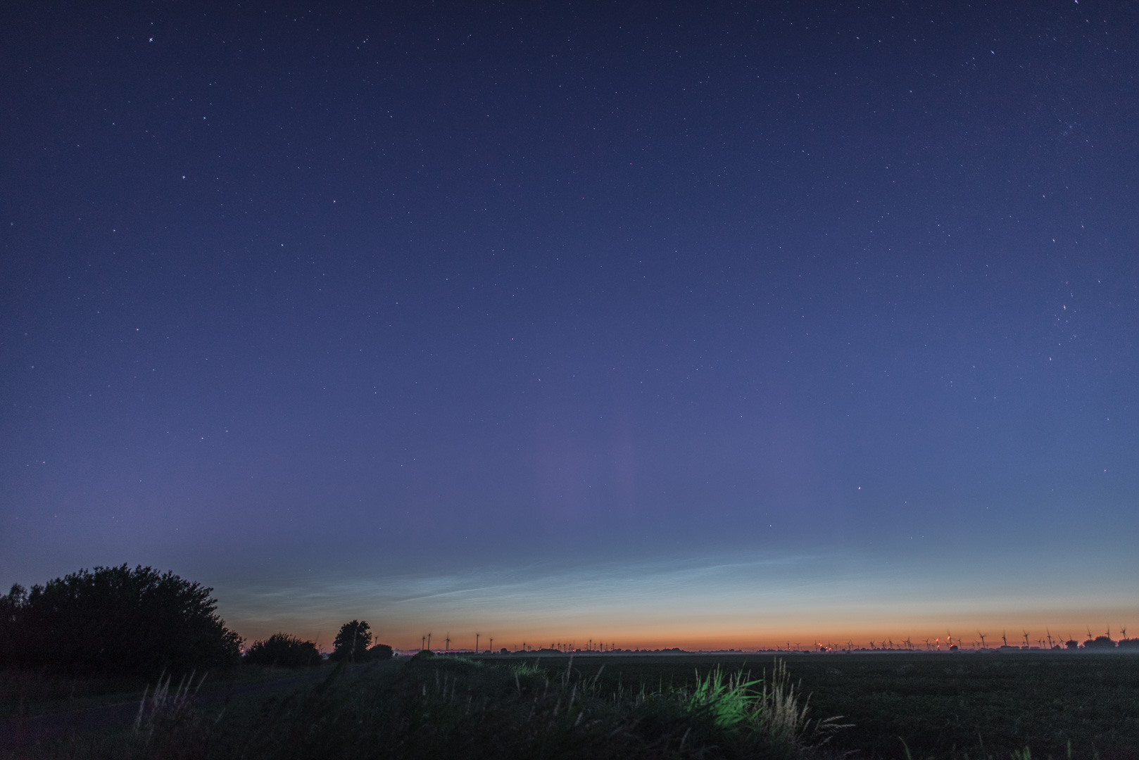 für mich überraschend gab es in der Nacht für kurze Zeit in etwa um 0:03 UTC fotografisches Polarlicht zusammen mit NLC. Wunderte mich schon in Anbetracht der Bedingungen (Dämmerung+Lichtverschmutzung in Hamburg). Anbei ein paar Bilder: