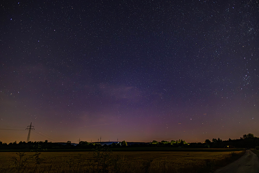 das Polarlicht kam dann doch überraschend. Ich wollte eigentlich nach einer Glühwürmchen-Beobachtung nach Hause, schaute aber nochmal kurz in die Sonnenwinddaten, wo ich dann einen etwas längeren negativen Bz-Wert sah. Da auch die Dichte leicht erhöht war und es einen Schwenk von negativen zu positiven Bz gab, blieb ich noch länger im Feld, was sich später als sehr gute Entscheidung erwies. Gegen 22:30 UTC konnte ich das erste Mal Polarlicht fotografisch nachweisen in Form eines einzelnen Strahls: Gegen 23 UTC wurde es dann deutlicher: Kleiner Höhepunkt, welcher schwach visuell war: Die Aktivität lies sehr schnell wieder nach, es glimmte aber noch etwas, durchaus auch nochmal mit dem ein oder anderen Strahl: Gegen 23:15 UTC war dann nichts mehr nachweisbar und ich brach die Beobachtung ab.