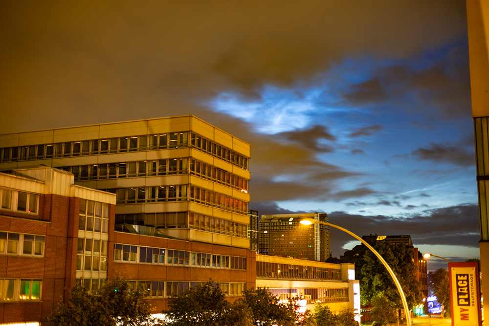 Gegen 4 Uhr Ortszeit bildeten sich schnell troposphärische Wolken und verdeckten die weiter höhersteigenden NLCs, weshalb ich schon davon ausgegangen bin, die Ausdehnung nicht weiter nachvollziehen zu können. Doch plötzlich (bei einem Sonnenstand von ca. -8,4°) wurden die NLCs nahezu über mir sichtbar: