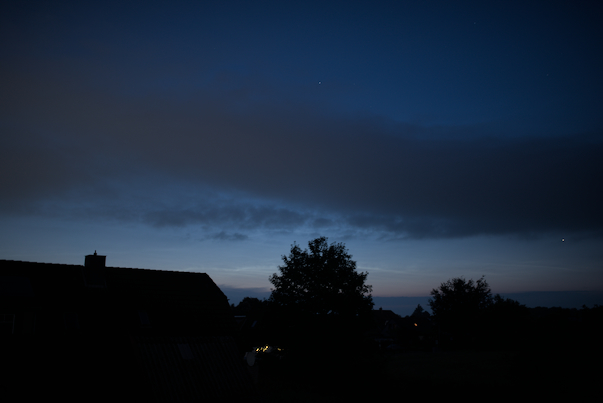 Da in Hemmingstedt die Bewölkung durchgängig die Sicht in den Himmel verhinderte, war ich überrascht als kurz nach 3 Uhr durch das Fenster Mondlicht zu sehen war. Im Garten waren NLC deutlich zu sehen. Bis sich die Wolkendecke wieder zuzog gelangen mir ca. eine viertel Stunde Aufnahmen.