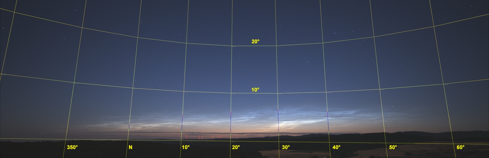 Die Kamerarückschau zeigt: ab ca. 22:20 UT schälten sich die NLC ziemlich genau in N aus der Suppe heraus und sie hielten sich bis min. 02:11 UT hoch in NO, wo ein (letztes?) langes Band von Wolken verschluckt wurde.