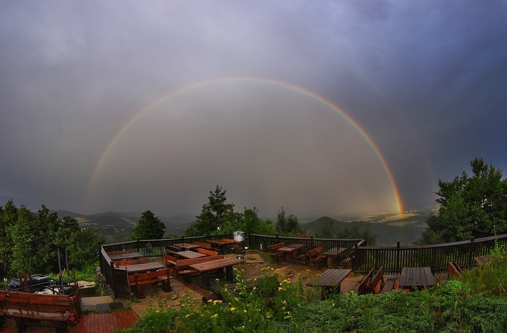 Nach Durchzug des Gewitters lockerte die Wolkendecke auf und es bildete sich in Richtung Südwesten ein heller doppelter Regenbogen.