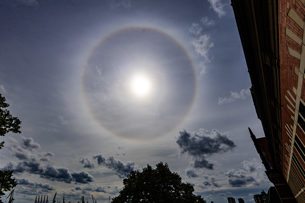 Ich fange mal mit dem Monats-Halo-Thread für August an. Am gestrigen 4.8. gab es in Hamburg einen intensiven 22°-Ring um die Sonne. Auffällig war auch der 9°-Ring, welcher schwach visuell zu erkennen war: